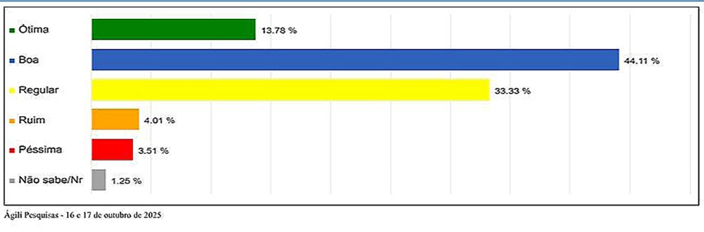 A pesquisa levantou ainda a classificação da administração do prefeito Denilson Baitala. Ela foi considerada boa por 44,11% dos entrevistados, sendo que 33,33% apontaram como regular, 13,78% como ótima; 4,01% disseram ser ruim, 3,51% classificaram como péssima e 1,25% não soube ou não quis responder.